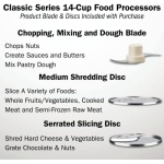 The Cuisinart DFP-14BCNY custom food Processor has an extra-large Feed tube that holds whole fruits and vegetables. Features a 14-Cup work bowl, 4mm stainless steel Medium slicing disc, stainless steel shredding disc, and chopping/mixing blade. Includes a spatula and recipe book.
