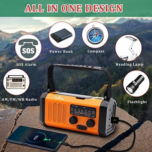 ⛺【Life Saver Weather Radio with Compass & SOS Alarm】When you’re in danger with body can’t move and cry for help isn’t loud enough, press the SOS button of this emergency hand crank solar radio, it will send out a 115dB SOS alarm and flashlight to catch the attention of rescuers. We also embedded a compass at the top of the product to orient yourself while on an adventure. All of these increase your chances of being rescued in the event of emergency.