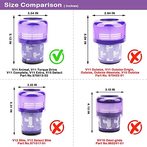 The vacuum filter adopt two-in-one design with H13 efficiency to trap trash ,dirt, dust, pets hair in corners and edges.Premium Quality replacement filter perfectly fit for Dyson V11 V15 cordless stick vacuums.Compatible with Dyson V11 Torque Drive V11 Animal V11 Complete V11 Extra V15 Detect V15s Detect Submarine Vacuums. Compare to part 970013-02 & 970013-03. NOT compatible with Dyson V11 Outsize, V15 Outsize, V11 Outsize Origin, V11 Outsize Origin+, Outsize, Outsize+, Outsize Absolute, Outsize Absolute+, V12 Detect Slim, V12 Slime ,SV12, SV16, SV19 Omni-Glide, Cyclone V10 Animal, V10 Absolute, V10 Cyclone, V10 Total Clean, Micro 1.5kg, Gen5detect Absolute, Gen5outsize Vacuums. Please confirm your accessories model and size before order!NOTE: Any use OEM brand name or model designation is made solely to demonstrate compatibility.