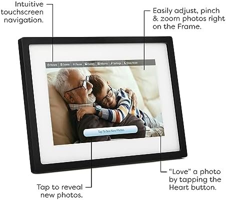 Swipe through photos, browse the gallery, pinch and zoom to adjust photos, delete photos, or pause the slideshow—all directly on the Frame.